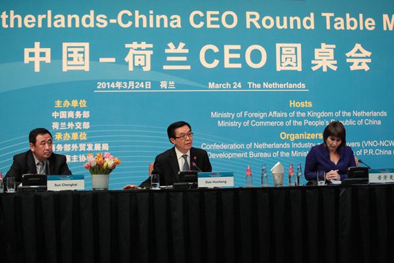 3月24日,在陪同习近平主席访荷期间,高虎城部长与荷兰外贸大臣普劳曼共同出席了中荷CEO圆桌会。
