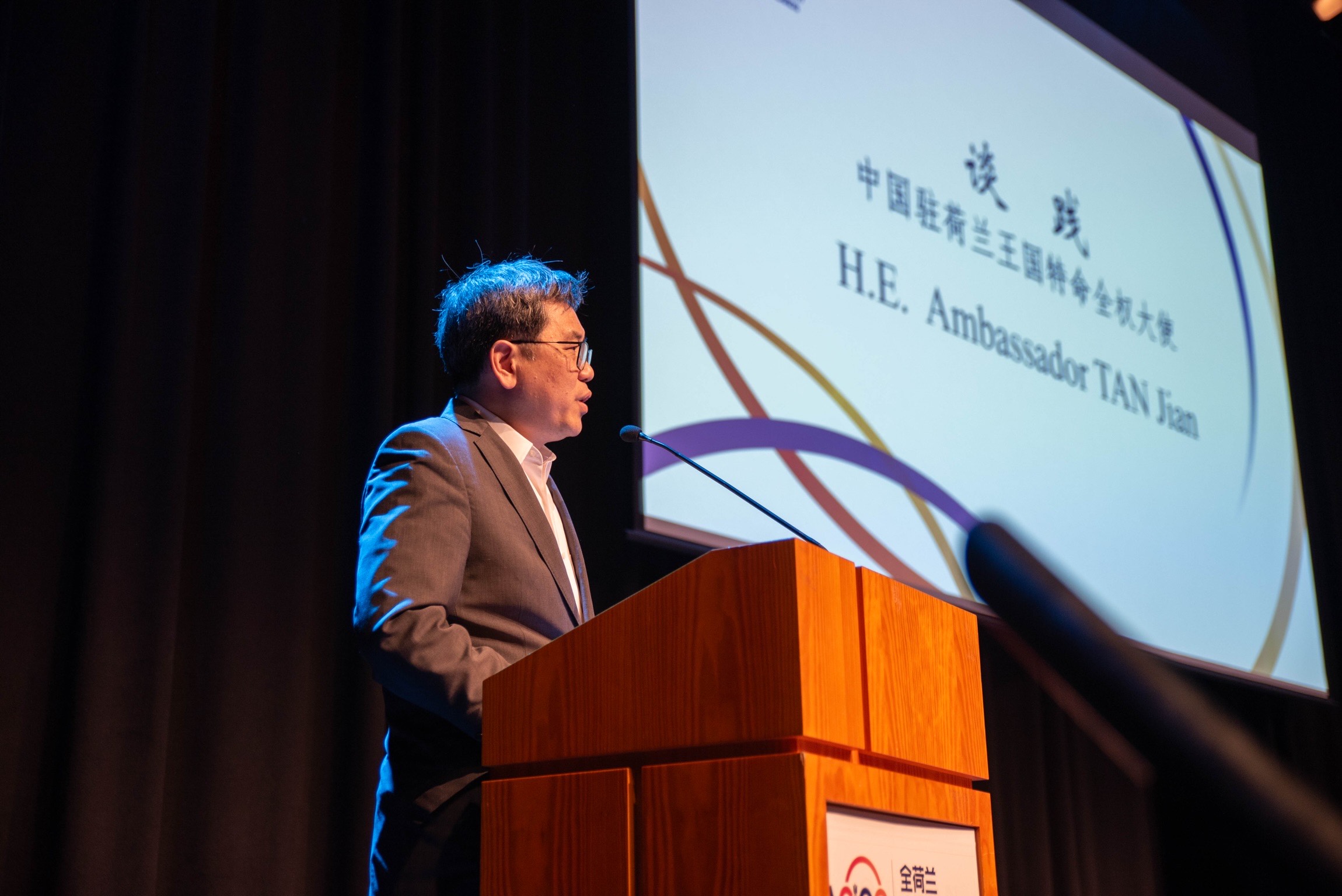 谈践大使在主旨发言中对协会为中荷双边关系发展所做出的贡献表示肯定和感谢。谈大使表示,自2014年习近平主席与亚历山大国王一道明确了中荷两国“开放务实的全面合作伙伴关系”新定位以来,双方高层交往密切,各领域互动频繁,双边关系不断发展。两国在经贸合作方面优势高度互补,荷兰是中国在欧盟的第二大贸易伙伴和第二大外资来源地,也是重要的投资目的国。这些成绩的取得,离不开各位企业家的智慧、努力和辛勤付出。谈大使向各位企业家提出几点希望,一是坚定理想信念,胸怀“国之大者”;二是发扬企业家精神,推进务实合作;三是坚持依法合规,确保安全发展。